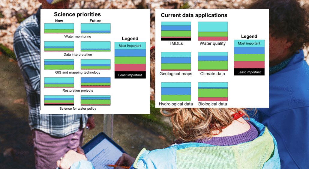 First let’s look at science priorities and how these are anticipated to change over time (Figure 1). Respondents indicated that all science categories were somewhat important for their current and future work (i.e., green, dark blue, and light blue sections in Figure 1). However, water monitoring, data interpretation, and restoration projects ranked above GIS applications and technical reviews for water policy. Respondents also anticipated increasing needs for scientific support for water monitoring, data interpretation, and GIS mapping technology in the future. In contrast, technical support for restoration projects policy became less of a priority for anticipated future needs (Figure 1).